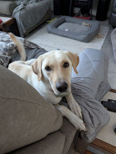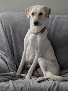 I’m friendly with other dogs and am sharing my foster home with a male Lab around my age, we get along really well. I’ve also been respectful with cats.